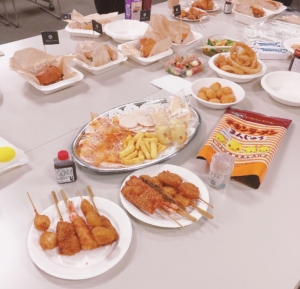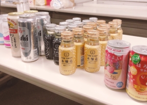 矢倉先生がよく旅行されるという淡路島の名物・淡路島バーガーや玉ねぎスープのほか、月桂冠株式会社様からご提供いただきました日本酒「THE SHOT」、池田市・日清食品の「チキンラーメンまんじゅう」等が好評を博しました。