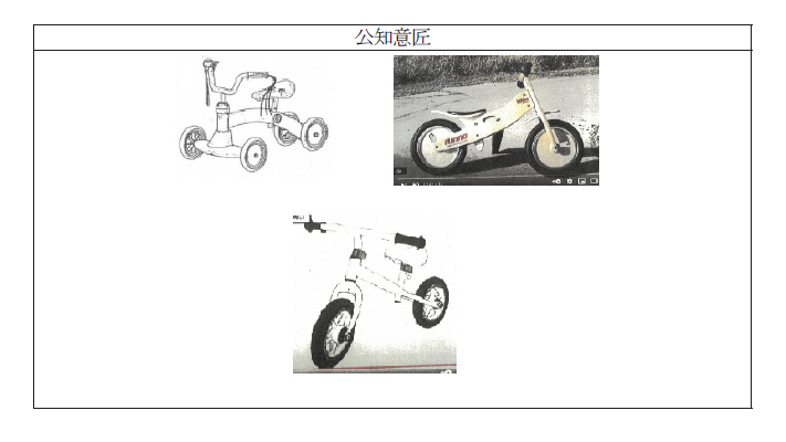 本件意匠の基本的構成態様のうち、①垂直状のハンドルステム(構成態様A)、②左右平行一対の前輪(A)、③下方に略25°傾斜して伸びるフレーム(B)、④フレーム略中央上部に設けられるサドル(B)、⑤前輪と略同径の後輪(B)、⑥2つの前輪が存する前方の車幅が幅広で、後輪が存する後方が幅狭の形状(D)は、それぞれ、個別には公知意匠にもみられるけれど、各要素を組み合わせた全体としての形状を有する公知意匠はなく、また、構成態様Cによって特定された寸法比率等の公知意匠はみあたらないとしました。