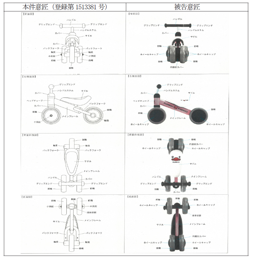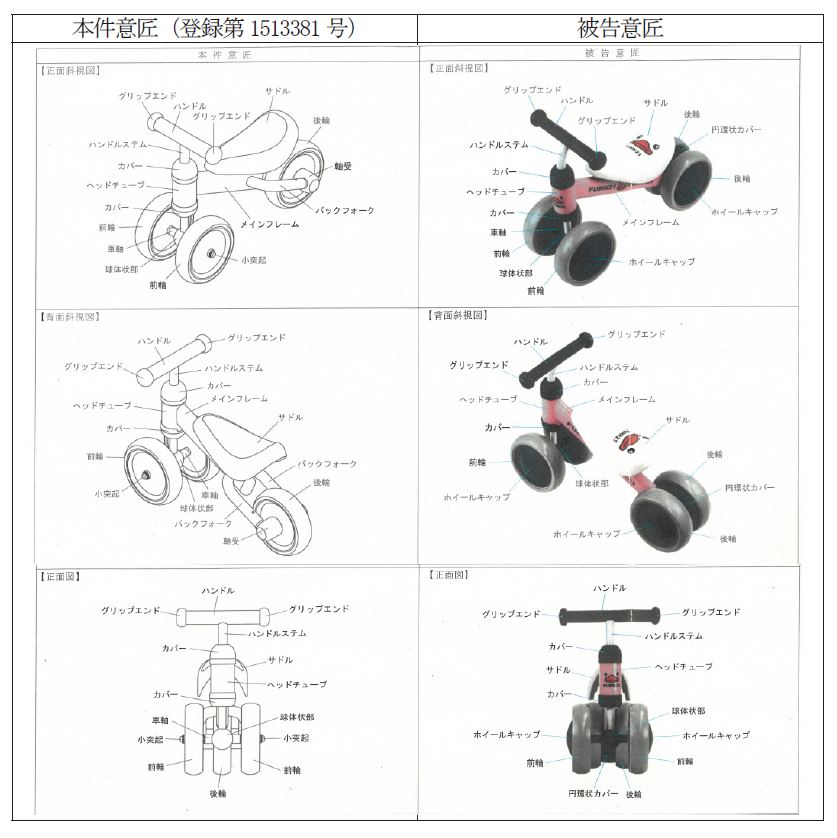 なお、両意匠は後輪の数に違いがありますが、後輪が2つある被告意匠も、その間に2つうの車輪よりわずかに小径の円環状カバーを挟んで三層状に形成されているため、なお一体のものであるとの印象を与えるとして、当該差異点についての被告の主張は採用されませんでした。