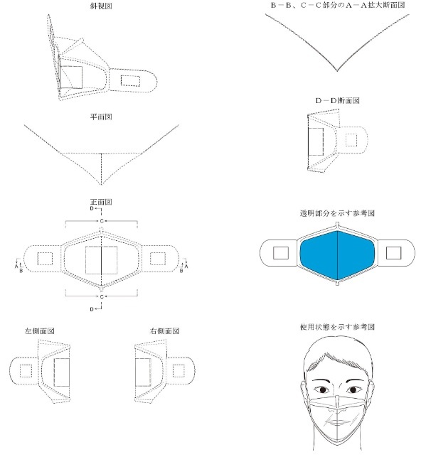 透明で口元が見えるマスクは、聴覚障がいのある方が口元の動きで相手が言っていることを理解するためといったニーズから、いろいろなメーカーによって製造販売がされています。そのため、マスクの前面部を透明にした意匠自体は、既にありふれていると言えます。そんな中、本願意匠は透明な前面部の、さらに中心部の一部だけを特定して出願がされています。意匠の特定の範囲がすごく小さいため、新規性欠如などで拒絶査定にならないか出願時に悩んでしまいそうです。すごく攻めた出願の仕方だと感じました。