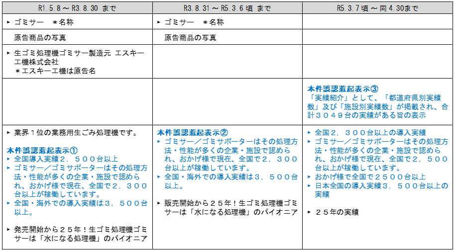 前提事実(5)エによれば、被告が令和元年5月8日以降販売している被告商品の過去の累計販売数は2300台に達するものではないことが認められ、(―中略―)いずれも、実際の販売実績とは異なるにもかかわらず、多数の被告商品が販売されており、このような販売実績は、被告商品のごみ処理方法及びその性能が他の同種商品に比べて優れたものであることに起因することを強調するものであって、その結果、需要者に対し、被告商品がその品質において優れた商品であるとの権威付けがされ、また、他の需要者も購入しているという安心感を与えることになるため、需要者が商品を購入するか否かの合理的な判断を誤らせる可能性があるというべきである。そうすると、本件誤認惹起表示①は、「品質」について「誤認させるような表示」に該当すると認められる。