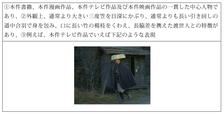 本件テレビ作品の映像の一部に係る人物写真と、被告図柄との同一性を検討し得る部分は、明らかに創作的表現がない部分にとどまることからすれば、被告図柄の製作が複製又は翻案に該当しないことは、自明である(最高裁平 成11年(受)第922号同13年6月28日第一小法廷判決・民集55巻 4号837頁参照)。のみならず、被告図柄で記述された渡世人の姿についてみると、三度笠の大きさは、概ね背丈ほどもある巨大なものであり、江戸時代の渡世人の姿とは異なるものである。また、口にくわえるものも顔の数倍程度もあるものであり、これを直ちに竹の楊枝であると認識し得るものとはいえない。そうすると、被告図柄の記述自体からは、本件渡世人のような江戸時代の渡世人を直接感得することはできないことからすると、上記において同一性を検討し得るとした部分についても、著作権法の観点から仔細に検討すれば、そもそも同一性を欠くものといえる。